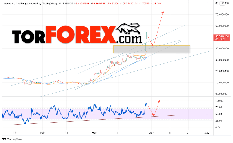 Дополнительным сигнальном в пользу роста котировок цифрового актива WAVES/USD тест линии тренда на индикаторе относительной силы (RSI). Вторым сигналом в пользу подъёма котировок WAVES/USD станет отскок от верхней границы бычьего канала. Отменой варианта роста курса криптовалюты Waves 30 марта 2022 года станет падение и пробой области 37.05. Это укажет на пробой области поддержки и продолжение падения курса криптовалюты с потенциальной целью ниже области 27.55. С пробоем области сопротивления и закрытием котировок выше уровня 53.45 стоит ожидать подтверждения развития восходящей тенденции по Waves.