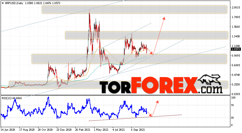 Дополнительным сигналом в пользу роста котировок XRP на текущей торговой неделе 1 — 5 ноября 2021 выступит тест линии поддержки на индикаторе относительной силы. Вторым сигналом станет отскок от нижней границы бычьего канала. Отменой варианта роста криптовалюты Ripple станет падение цен и пробой области 0.6505. Это укажет на пробой области поддержки и продолжение падения котировок XRP/USD с целью ниже уровня 0.5005. Подтверждением роста криптовалюты выступит пробой области сопротивления и закрытие котировок выше области 1.3785.