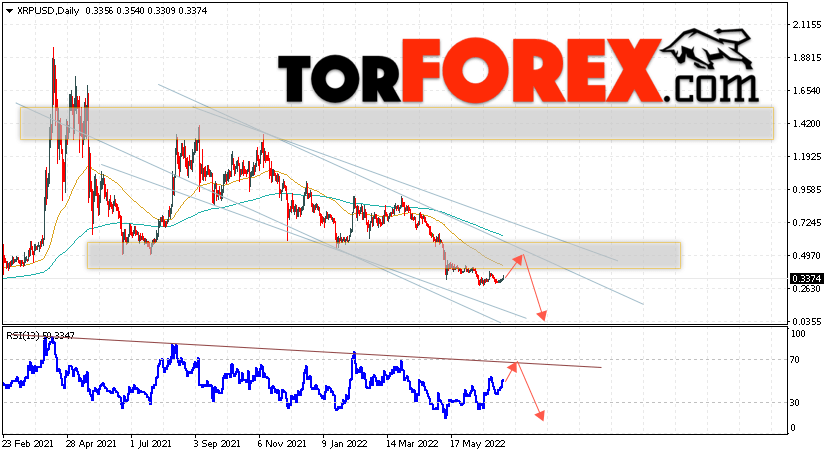 Дополнительным сигналом в пользу снижения котировок XRP на текущей торговой неделе 11 — 15 июля 2022 выступит тест линии сопротивления на индикаторе относительной силы. Вторым сигналом станет отскок от верхней границы нисходящего канала. Отменой варианта снижения криптовалюты Ripple станет сильный рост цен и пробой области 0.7355. Это укажет на пробой области сопротивления и продолжение подъёма котировок XRP/USD с целью выше уровня 0.9505. Подтверждением падению криптовалюты выступит пробой области поддержки и закрытие котировок ниже области 0.2205.