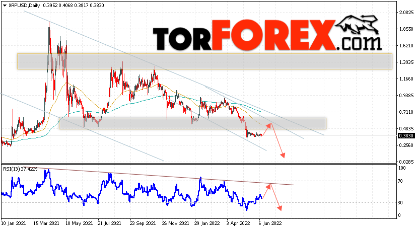 Дополнительным сигналом в пользу снижения котировок XRP на текущей торговой неделе 13 — 17 июня 2022 выступит тест линии сопротивления на индикаторе относительной силы. Вторым сигналом станет отскок от верхней границы нисходящего канала. Отменой варианта снижения криптовалюты Ripple станет сильный рост цен и пробой области 0.7405. Это укажет на пробой области сопротивления и продолжение подъёма котировок XRP/USD с целью выше уровня 1.1405. Подтверждением падению криптовалюты выступит пробой области поддержки и закрытие котировок ниже области 0.2565.