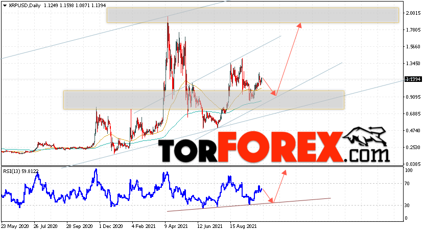 Дополнительным сигналом в пользу роста котировок XRP на текущей торговой неделе 18 — 22 октября 2021 выступит тест линии поддержки на индикаторе относительной силы. Вторым сигналом станет отскок от нижней границы бычьего канала. Отменой варианта роста криптовалюты Ripple станет падение цен и пробой области 0.6505. Это укажет на пробой области поддержки и продолжение падения котировок XRP/USD с целью ниже уровня 0.5005. Подтверждением роста криптовалюты выступит пробой области сопротивления и закрытие котировок выше области 1.3655.