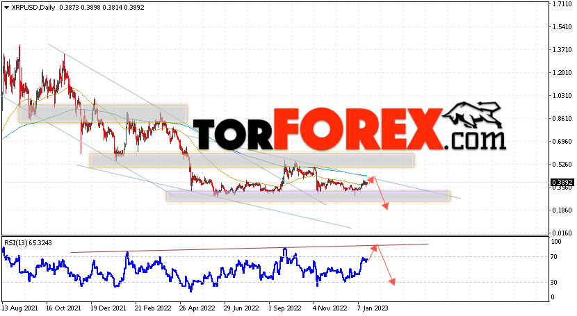 Дополнительным сигналом в пользу падения котировок XRP на текущей торговой неделе 23 — 27 января 2023 выступит тест линии сопротивления на индикаторе относительной силы. Вторым сигналом станет отскок от верхней границы нисходящего канала. Отменой варианта падения криптовалюты Ripple станет сильный рост цен и пробой области 0.5235. Это укажет на пробой области сопротивления и продолжение роста котировок XRP/USD с целью выше уровня 0.6505. Подтверждением падению криптовалюты выступит пробой области поддержки и закрытие котировок ниже области 0.3215.