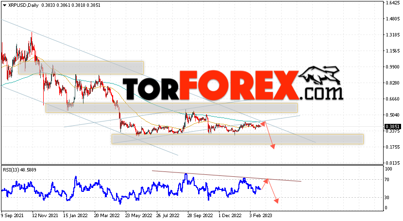 Дополнительным сигналом в пользу падения котировок XRP на текущей торговой неделе 27 февраля — 3 марта 2023 выступит тест линии сопротивления на индикаторе относительной силы. Вторым сигналом станет отскок от верхней границы нисходящего канала. Отменой варианта падения криптовалюты Ripple станет сильный рост цен и пробой области 0.5465. Это укажет на пробой области сопротивления и продолжение роста котировок XRP/USD с целью выше уровня 0.6505. Подтверждением падению криптовалюты выступит пробой области поддержки и закрытие котировок ниже области 0.3355.