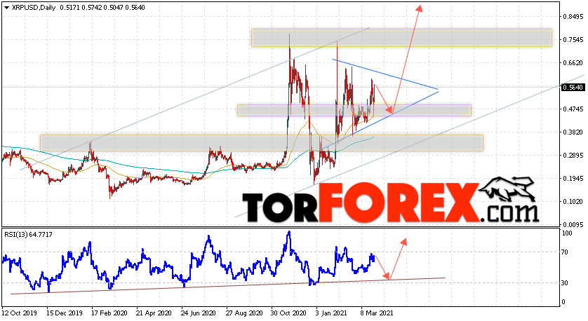 Дополнительным сигналом в пользу роста котировок XRP на текущей торговой неделе 29 марта — 2 апреля 2021 выступит тест линии поддержки на индикаторе относительной силы. Вторым сигналом станет отскок от нижней границы восходящего канала. Отменой варианта роста криптовалюты Ripple станет падение цен и пробой области 0.3505. Это укажет на пробой области поддержки и продолжение падения котировок XRP/USD с целью ниже уровня 0.2305. Подтверждением роста криптовалюты выступит пробой области сопротивления и закрытие котировок выше области 0.6705.