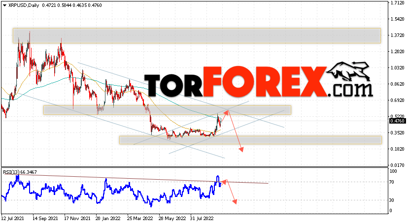 Дополнительным сигналом в пользу падения котировок XRP на текущей торговой неделе 3 — 7 октября 2022 выступит тест линии сопротивления на индикаторе относительной силы. Вторым сигналом станет отскок от верхней границы нисходящего канала. Отменой варианта падения криптовалюты Ripple станет сильны рост цен и пробой области 0.6055. Это укажет на пробой области сопротивления и продолжение роста котировок XRP/USD с целью выше уровня 0.7505. Подтверждением падению криптовалюты выступит пробой области поддержки и закрытие котировок ниже области 0.3345, что укажет на пробой нижней границы бычьего канала коррекции.