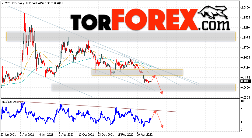 Дополнительным сигналом в пользу снижения котировок XRP на текущей торговой неделе 6 — 10 июня 2022 выступит тест линии сопротивления на индикаторе относительной силы. Вторым сигналом станет отскок от верхней границы нисходящего канала. Отменой варианта снижения криптовалюты Ripple станет сильный рост цен и пробой области 0.7355. Это укажет на пробой области сопротивления и продолжение подъёма котировок XRP/USD с целью выше уровня 1.1455. Подтверждением падению криптовалюты выступит пробой области поддержки и закрытие котировок ниже области 0.2455.