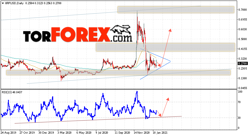 Дополнительным сигналом в пользу роста котировок XRP на текущей торговой неделе 1 — 5 февраля 2021 выступит тест линии поддержки на индикаторе относительной силы. Вторым сигналом станет отскок от нижней границы модели ”Треугольник”. Отменой варианта роста криптовалюты Ripple станет падение цен и пробой области 0.1355. Это укажет на пробой области поддержки и продолжение падения котировок XRP/USD с целью ниже уровня 0.1005. Подтверждением роста криптовалюты выступит пробой области сопротивления и закрытие котировок выше области 0.3965, что укажет на пробой верхней границы модели ”Треугольник”.