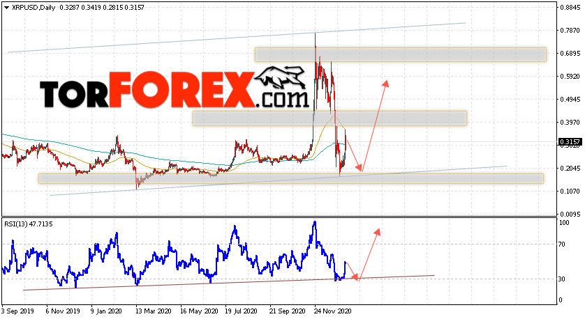 Дополнительным сигналом в пользу роста котировок XRP на текущей торговой неделе неделю 11 — 15 января 2021 выступит тест линии поддержки на индикаторе относительной силы. Вторым сигналом станет отскок от нижней границы восходящего канала. Отменой варианта роста криптовалюты Ripple станет падение цен и пробой области 0.1205. Это укажет на пробой области поддержки и продолжение падения котировок XRP/USD с целью ниже уровня 0.0095. Подтверждением роста криптовалюты выступит пробой области сопротивления и закрытие котировок выше области 0.3855.