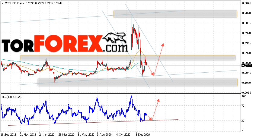 Дополнительным сигналом в пользу роста котировок XRP на текущей торговой неделе неделю 18 — 22 января 2021 выступит тест линии поддержки на индикаторе относительной силы. Вторым сигналом станет отскок от нижней границы восходящего канала. Отменой варианта роста криптовалюты Ripple станет падение цен и пробой области 0.1205. Это укажет на пробой области поддержки и продолжение падения котировок XRP/USD с целью ниже уровня 0.0065. Подтверждением роста криптовалюты выступит пробой области сопротивления и закрытие котировок выше области 0.3965.
