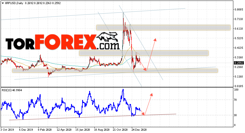 Дополнительным сигналом в пользу роста котировок XRP на текущей торговой неделе неделю 25 — 29 января 2021 выступит тест линии поддержки на индикаторе относительной силы. Вторым сигналом станет отскок от нижней границы восходящего канала. Отменой варианта роста криптовалюты Ripple станет падение цен и пробой области 0.1205. Это укажет на пробой области поддержки и продолжение падения котировок XRP/USD с целью ниже уровня 0.0095. Подтверждением роста криптовалюты выступит пробой области сопротивления и закрытие котировок выше области 0.3965, что укажет на пробой верхней границы нисходящего канала.
