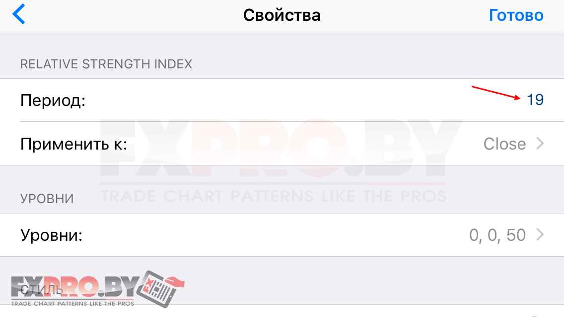 • Индикатор RSI с периодом 19 и уровнем 50