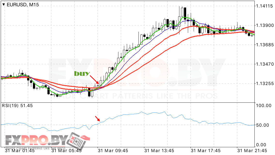 Если быстрая скользящая с периодом 5 уже давно пробила коридор вверх, то в этом случае мы получаем очень сильный сигнал к покупке. Значения же индикатора относительной силы RSI должны находиться выше уровня 50, это является подтверждением восходящего тренда на рынке в этот момент.