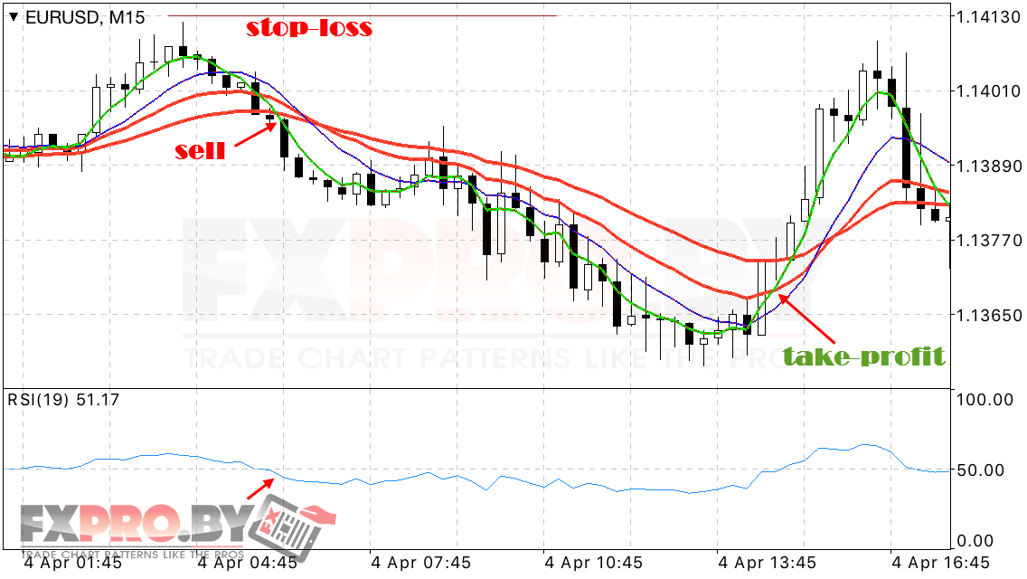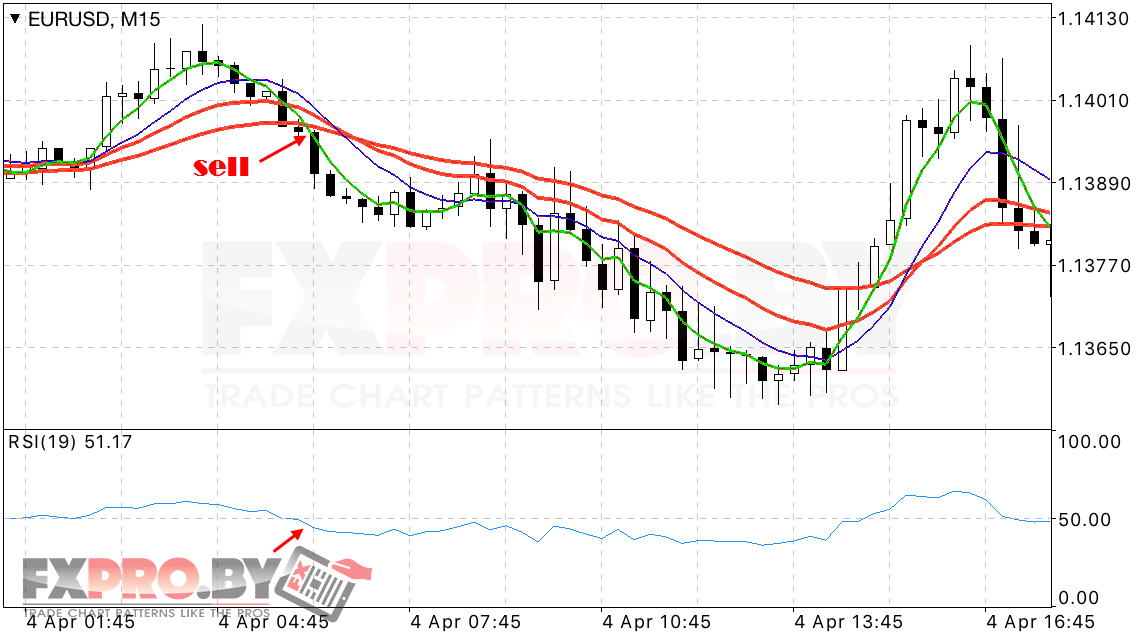 Сделку на продажу по системе мы открываем в момент, когда быстрые скользящие WMA пересекают коридор сверху вниз. Также не забываем, что значения индикатора относительной силы должны быть ниже уровня 50. Что будет указывать на потенциальную нисходящую тенденцию на рынке Форек в этот момент времени.