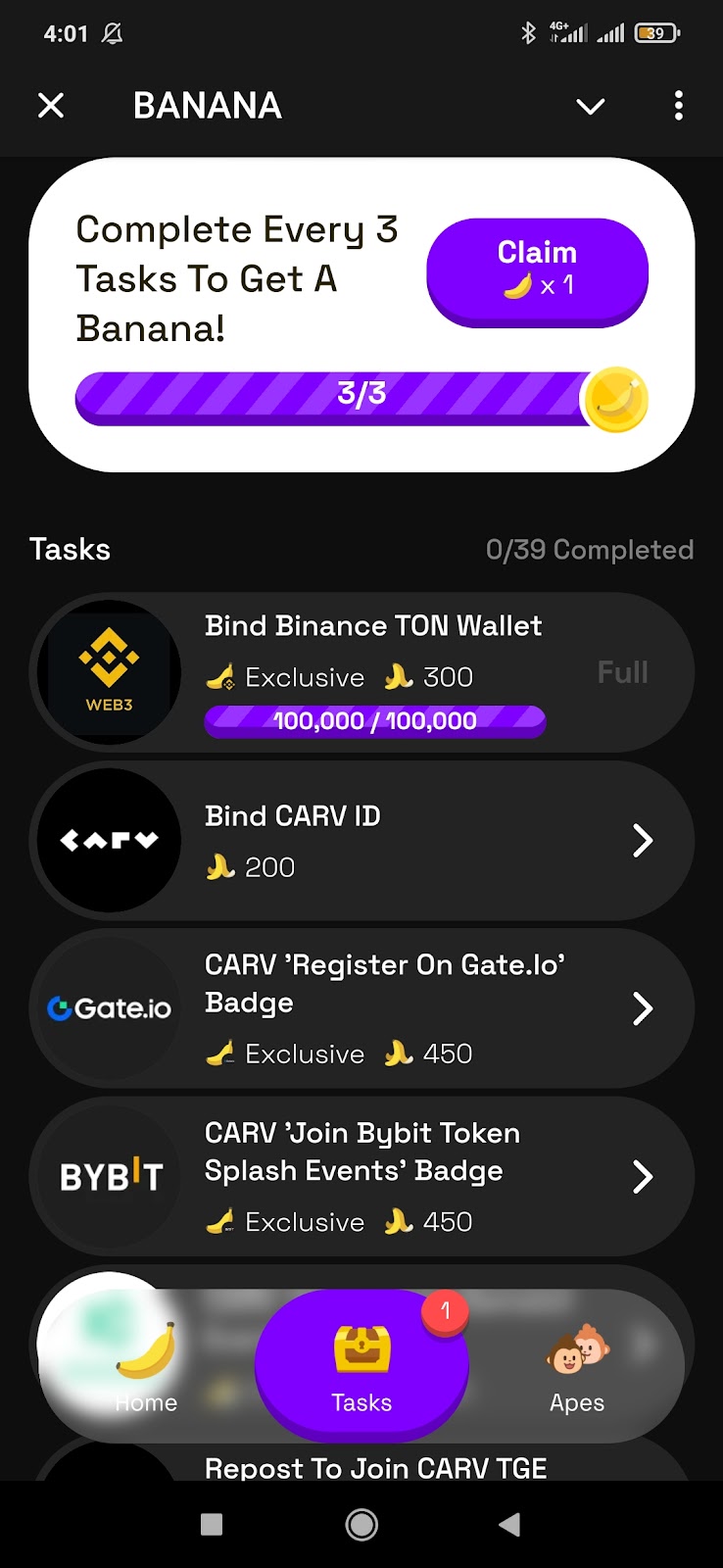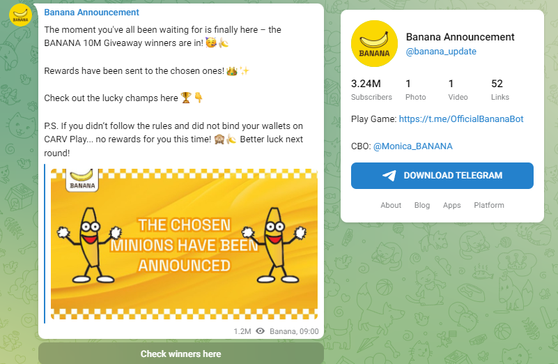 В Телеграм канал Banana нет сведений об аирдропе. Зарабатывать токены и выводить можно уже сейчас. Дополнительный Banana Carv airdrop можно получить при участии в активностях в Steam.