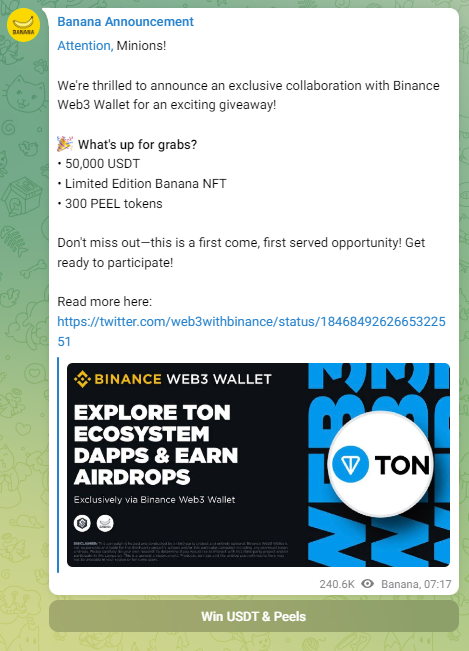 В настоящее время в Телеграмм Banana проходит розыгрыш 50 тысяч долларов, лимитированной коллекции NFT Banana crypto и токенов PEEL в коллаборации с Бинанс. Проект поддерживается крупнейшими криптовалютными биржами в секторе WEB3, и это очень позитивный момент.