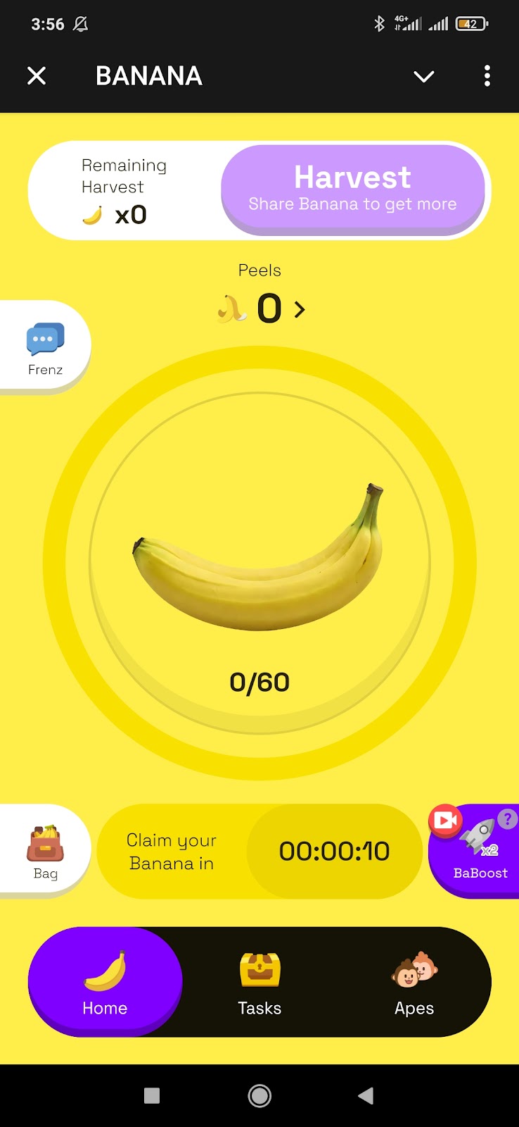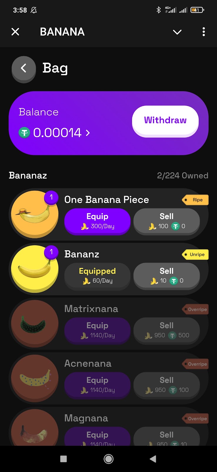 Раздел BAG — сумка с НФТ в виде бананов. От их редкости зависит доход. За какие-то можно получить 100 поинтов, равных 0,00014 USDT, за другие плата будет выше — 500 фишек или 0,0007 USDT.
