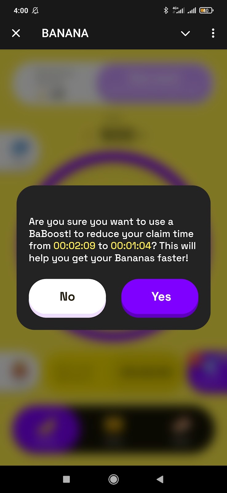 BaBoost — ускоритель клейма в Banana bot telegram. Первый раз можно клеймить банан сразу после входа, затем будет кулдаун 5 минут, далее полтора часа. Использование буста ускоряет процесс в два раза, можно использовать несколько раз подряд. Получить его можно за просмотр рекламы или случайно выбить, тапая по экрану.