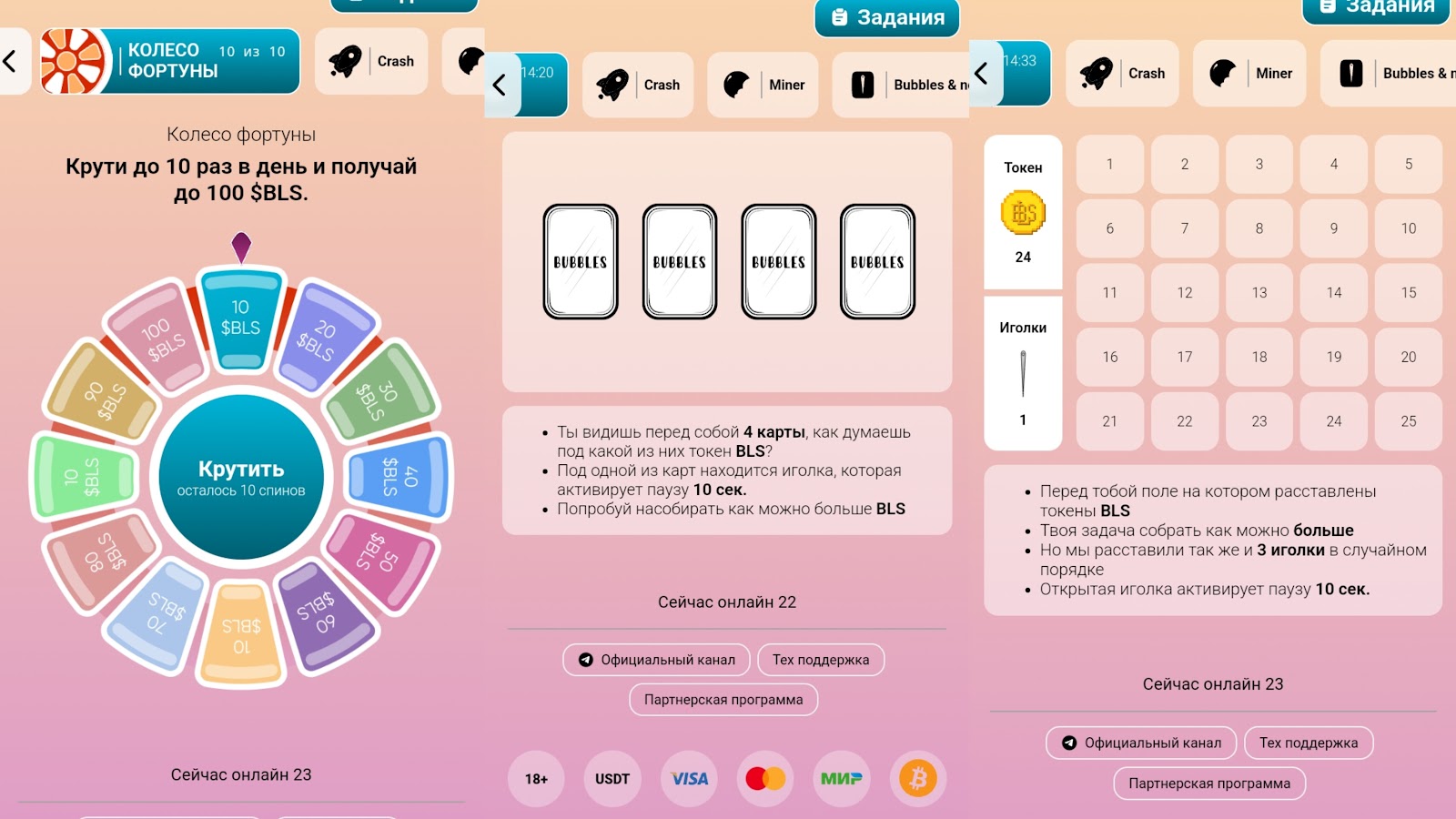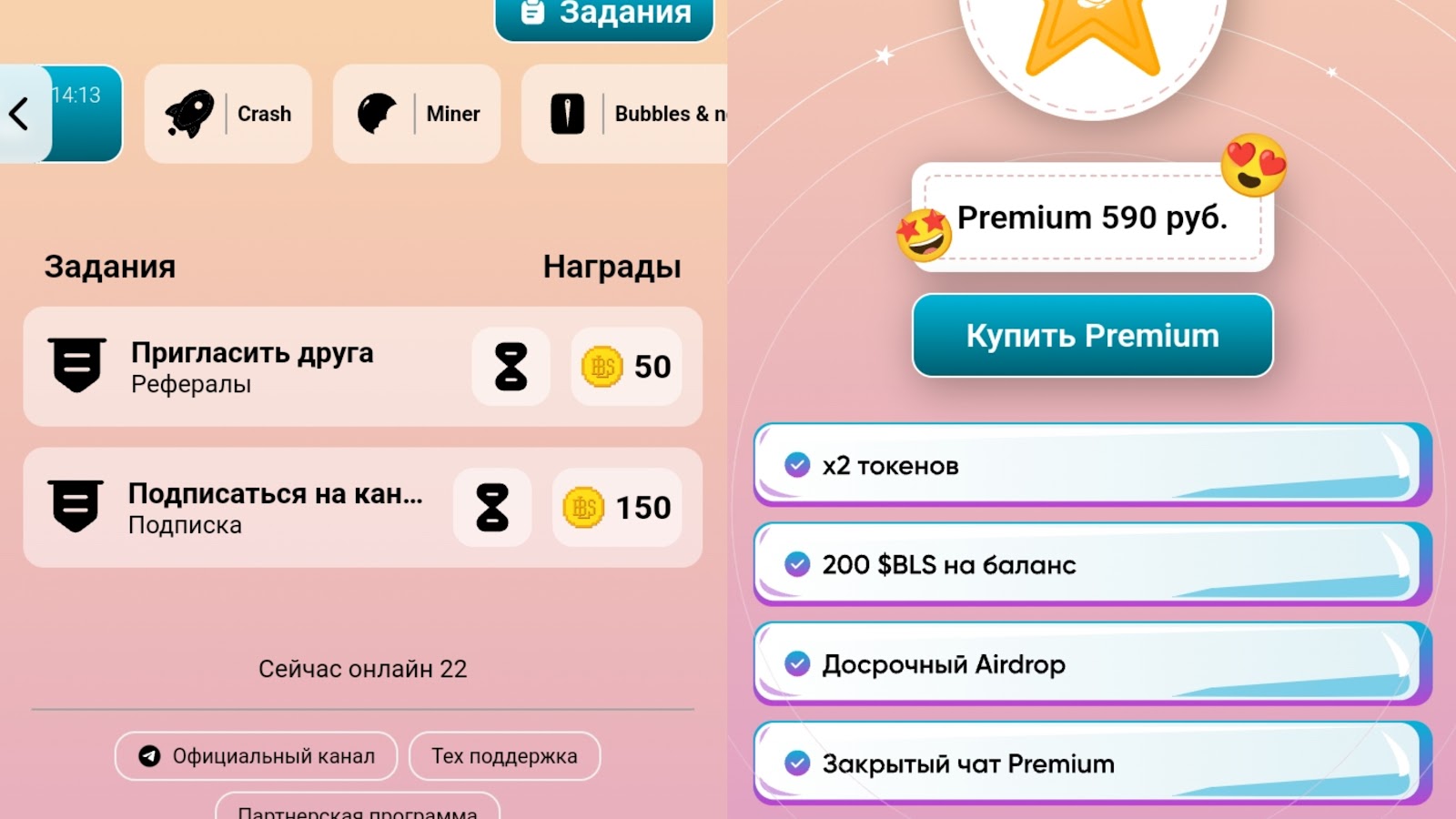 Игроки могут получать токены BLS за выполнение заданий. Необходимо угадывать из 4 карт одну с изображением монеты. Другим заданием является угадать, в каких квадратах с цифрами находятся монеты, избегая ловушек. Помимо этого, основатели предлагают выполнять актуальные задачи. Например, подписка на тг канал оценивается в 150 коинов. За участие в реферальной программе можно набрать дополнительные коины. При желании игрок сможет воспользоваться тарифом Премиум за 590 рублей. Он включает: