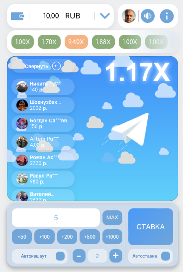 После того, как выставлена подходящая сумма, понадобится нажать на кнопку «Ставка». Когда начнется раунд, в главном виджете будет указываться размер текущего рейта. Чем он выше, тем, соответственно, значительнее будет награда. Задача игрока – вовремя нажать на кнопку «Стоп».