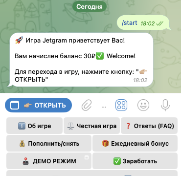 Чтобы запустить игру JetGram, необходимо вначале зайти в телеграм-бот JetGram Gamebot, Jetgram Bot. После того, как он будет активирован, потребуется нажать на кнопку «Открыть».