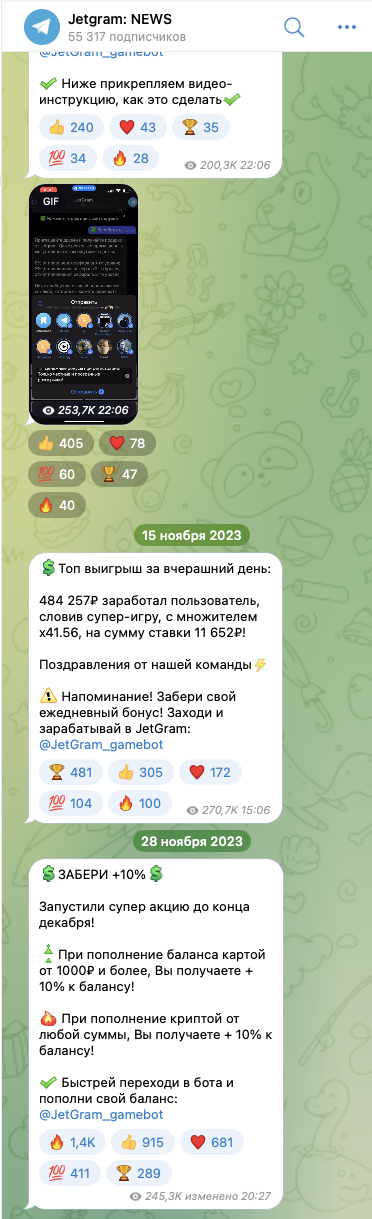У проекта есть телеграмм-канал – Jetgram News. На него, на 11 октября 2024-го года, подписано около 55,3 тысяч пользователей.