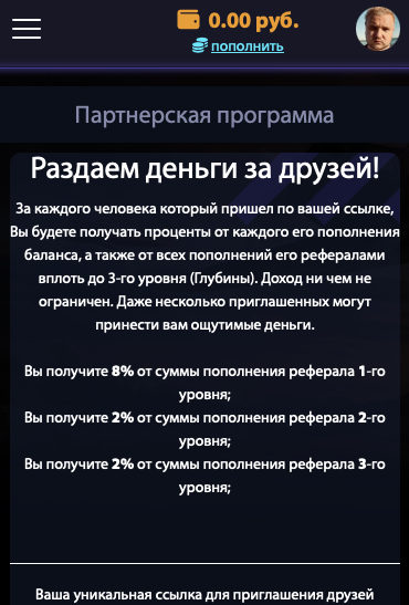 Более того, партнерская программа является трехуровневая. Так за пополнение счетов рефералов, которых привели рефералы, дается 2%.