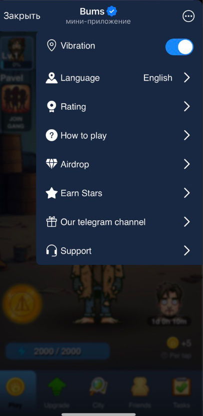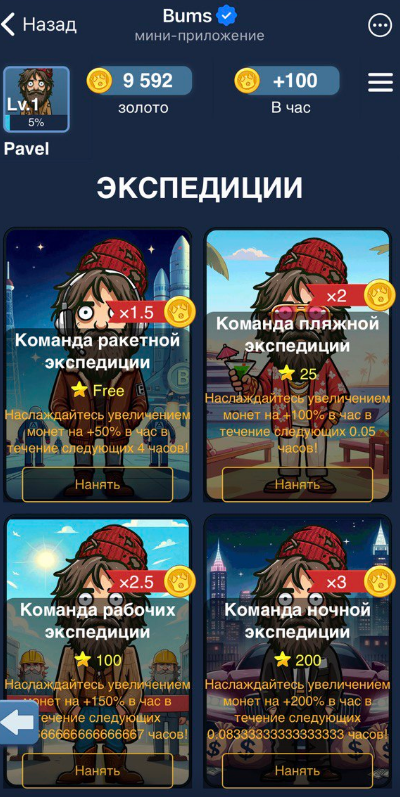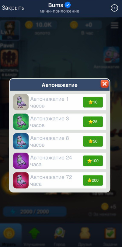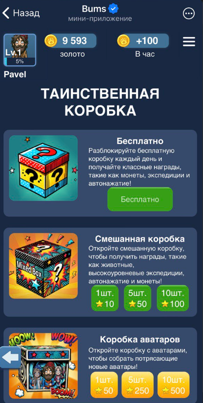 Перед тем как играть в Bums, нужно отметить, что проект хоть и бесплатный, но донат в игре есть. И он создает дисбаланс. Покупая за Stars коробки с улучшениями и активируя автоматический кликер Bums, зарабатывать монеты становится сильно проще. Однако вложения дают ощутимый буст лишь на старте. Если не вкладывать и раскачать аккаунт, то доход также будет довольно ощутимым. Просто на его получение потребуется больше времени.