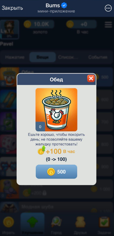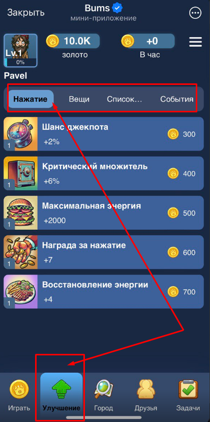 Остальные элементы основного экрана интуитивно понятны – это шкала энергия для тапанья, вступление в гильдии, показатель автоматического дохода в час и т. п. Важнее то, что содержит основное меню внизу экрана. В частности, кнопка улучшений приводит в соответствующий раздел игры Bums.