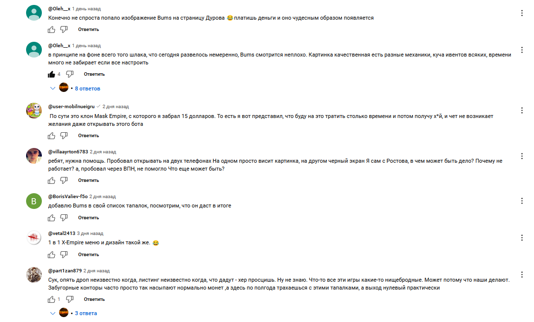 Странно, но найти оставленные в адрес игры Bums в Телеграмме отзывы оказалось совсем непросто. Это тревожно. Поскольку проект с таким фундаментальным бэкграундом просто обязан был бы привлечь внимание. К тому же игра активно ведет социальные сети, и уж там-то точно должны были бы быть отзывы о тапалке Bums. Но, просматривая соцсети, можно встретить обилие совершенно бесполезных комментариев.
