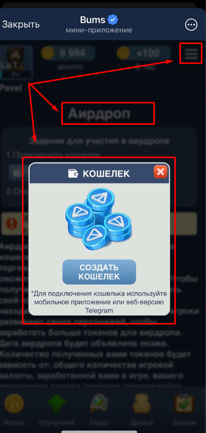 В верхнем меню справа есть вкладка Airdrop, где каждый пользователь может привязать свой криптокошелек с поддержкой блокчейна TON.