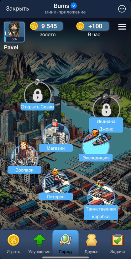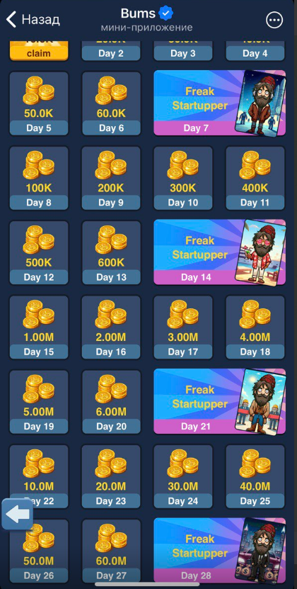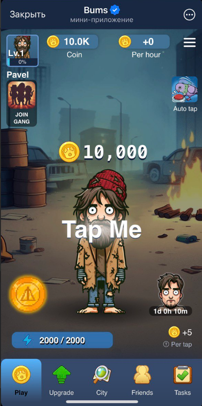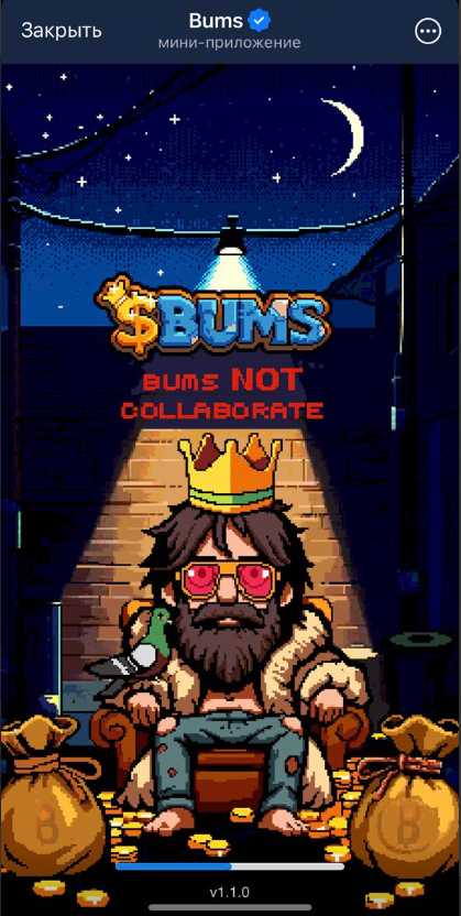 Bums – Telegram игра, которую запустили 10 сентября 2024 года. Она представлена в жанре «tap-to-earn», но здесь геймплей не ограничен одним лишь тапаньем экрана. По аналогии с Mask Empire и Hamster, разработчики предлагают игрокам формировать пассивный доход за счет прокачки различных карт. Делая это и накапливая монетки, центральный игровой персонаж получает также очки опыта и развивается. Со временем это позволит ему превратиться из бездомного в успешного бизнесмена или даже настоящего криптокороля.