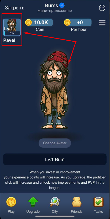 Вверху слева видим уровень своего персонажа в тапалке Bums в ТГ.