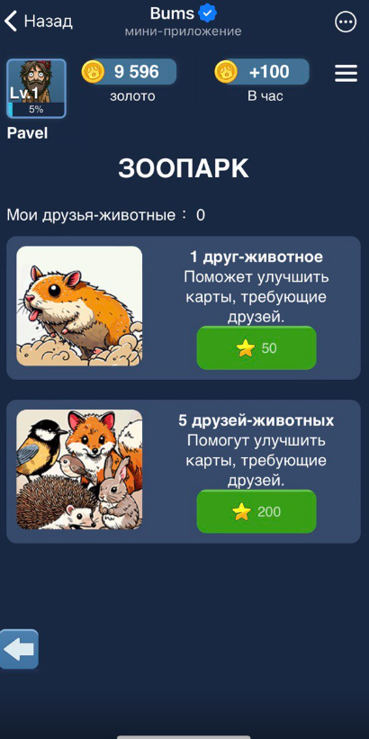 Раздел «Зоопарк» позволяет задонатить «звезды», чтобы приобрести питомца, дающего различные бусты.