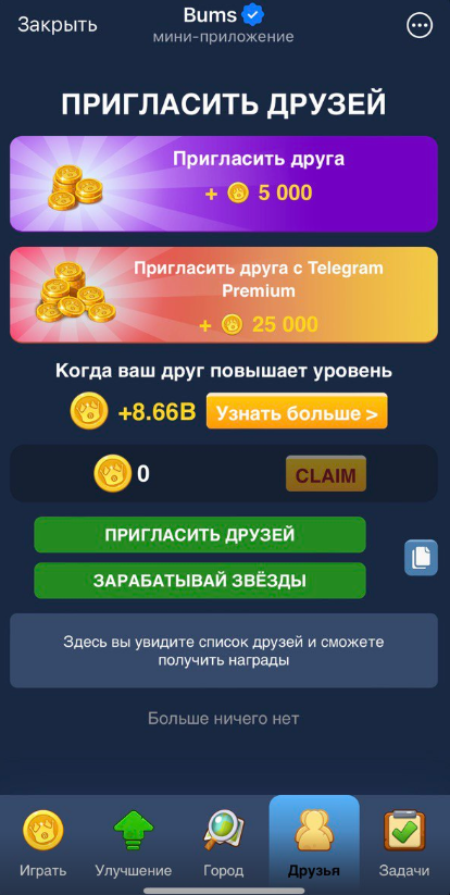За простого пользователя дают 5000 монет, за игрока с Telegram Premium 25 000. К тому же есть бонусы, которые начисляются, когда привлеченный пользователь прокачивает уровень своего бездомного.