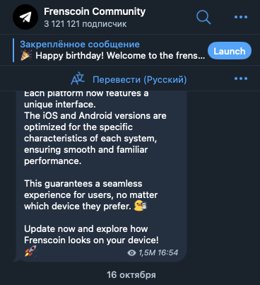 На 25 октября 2024-го года на телеграмм-канал Frenscoin Community подписано около 3,12 миллиона пользователей. Публикации просматриваются в среднем 1,5 миллиона раз.
