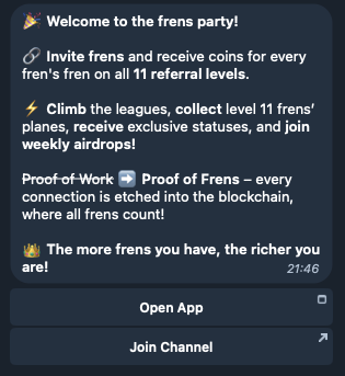 Frens Coin – аналог Dogs. Чтобы получать в приложении деньги, нужно активно привлекать в проект новых участников. За счет продуманной реферальной программы создатели приложения за 2 недели после запуска привели в игру более 3 миллионов пользователей.
