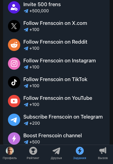 Чтобы зарабатывать монеты во Frenscoin, не требуется бесконечно тапать на кнопку. Вместо этого нужно выполнять задания и приглашать в игру новых участников.