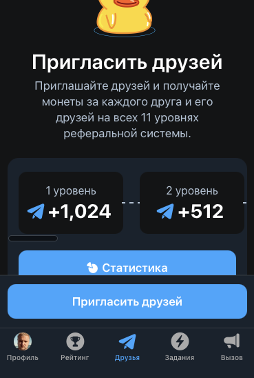 В игре 11-уровневая реферальная программа. За каждого приведенного нового участника выплачивается 1024 монеты. За тех, кого пригласили друзья – 512. С каждым уровнем награда становится меньше в 2 раза.