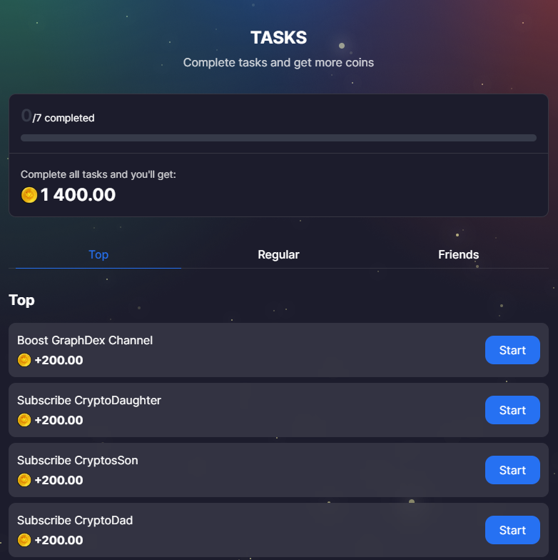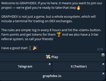 Graph dex в Телеграм — тапалка второго поколения. Пользователям необходимо заходить раз в 8 часов, забирать награду и выполнять задания. Других игровых активностей нет.