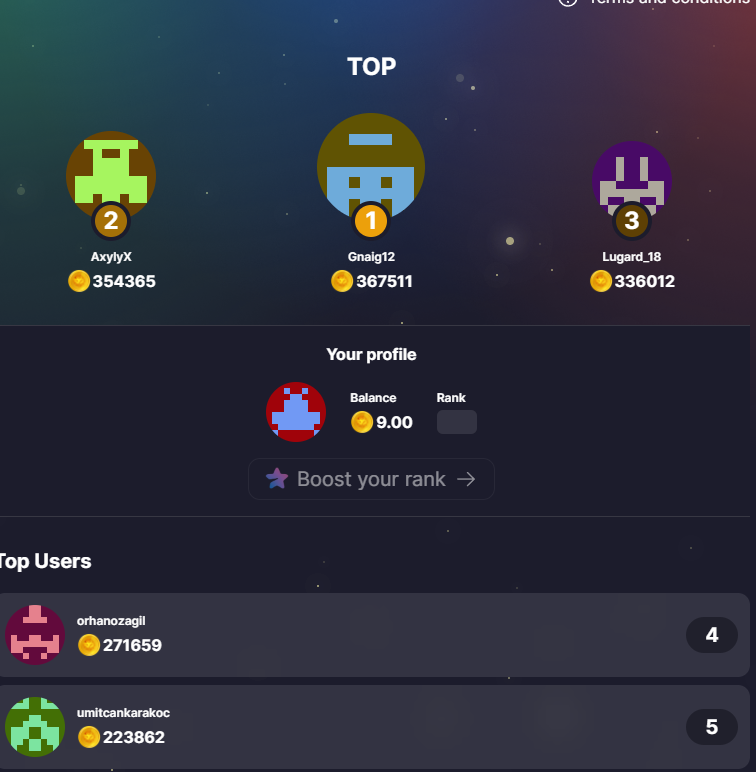Разработчики реализовали функцию ТОПа пользователей. В списке игроков можно посмотреть свое место и самых богатых игроков. С 1 по 3 место лидируют с существенным отрывом.