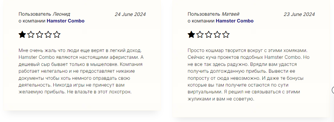 Многие пользователи отмечают, что Hamster Combo использует заманчивую рекламу с обещаниями легкого дохода, привлекая новичков низкими минимальными депозитами. Однако реальный функционал игры вызывает недовольство из-за плохой работы.