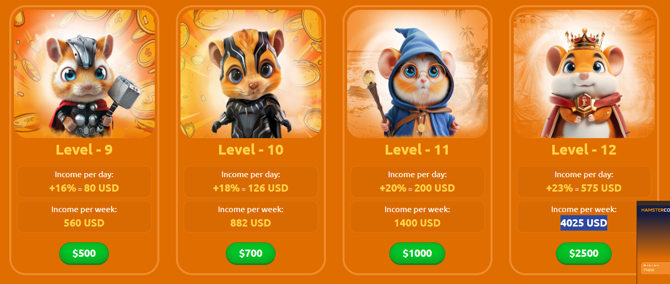 В игре существует 12 уровней хомяков. Каждый из них генерирует определенный процент дохода в зависимости от вложенной суммы. Например, на 1 уровне доход составляет 6% в день.