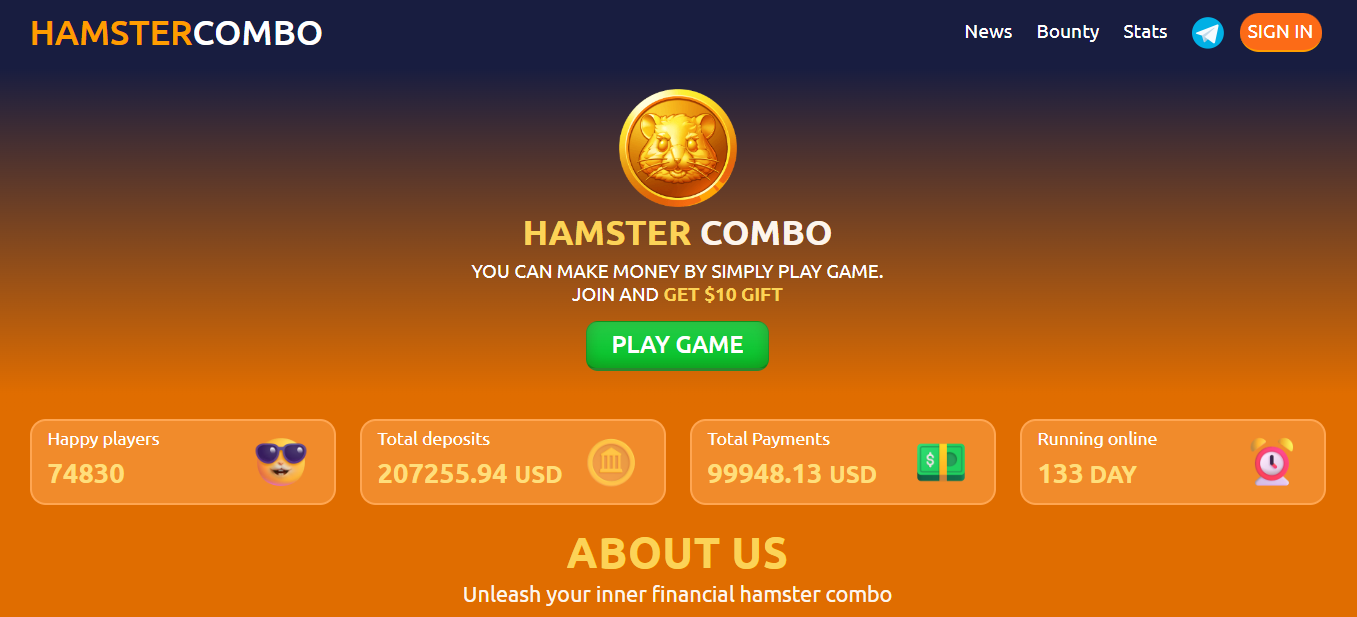 На сайте приведена статистика. Hamster Combo привлекла уже более 74 тысяч пользователей и функционирует 133 дня. Игра предоставляет пользователям стартовый бонус в размере $10, чтобы они могли начать без дополнительных вложений. Это развод. Эти деньги пользователи не смогут вывести. Они нужны только для того, чтобы подогреть интерес к игре новых участников.
