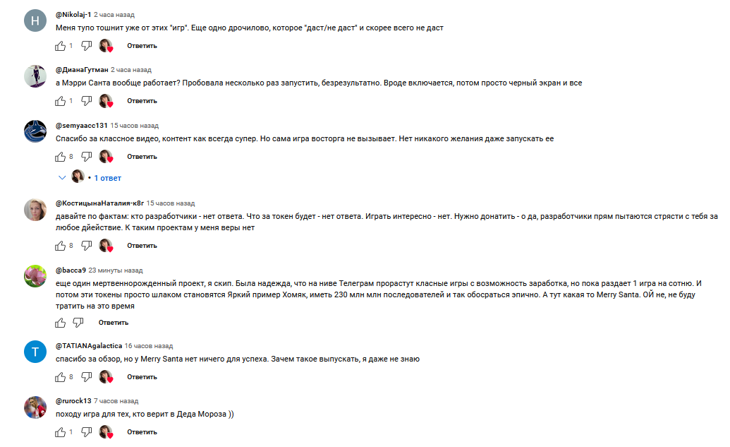 Отыскать отзывы о тапалке Merry Santa очень сложно. Учитывая, что проекту больше месяца, это плохой признак. Поскольку такое положение дел свидетельствует лишь об одном – проект непопулярный, пользователи о нем не говорят. Лишь на просторах Youtube удалось найти несколько сообщений.