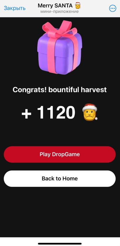 По истечению указанного времени появляется оповещение о заработанных токенах и предлагается либо начать новую DropGame, либо вернуться на главный экран.