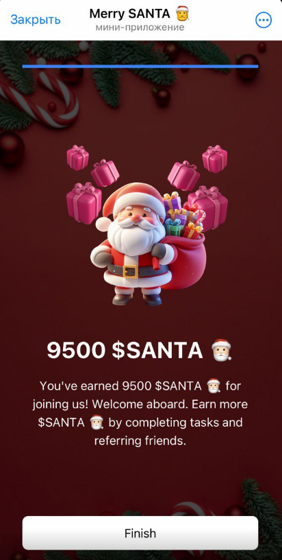 За каждого приглашенного дают по 0,1 TON, а также 30% доли от объема накопленных рефером монет Santa.