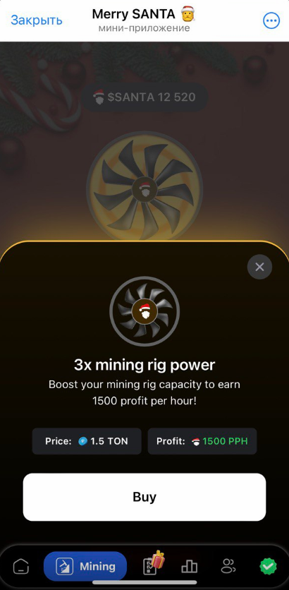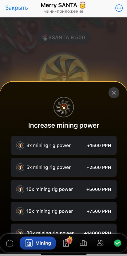 Первоначально скорость добычи составляет 2500 Santa в час. Однако если нажать на Boost Mining, то можно купить улучшения и повысить интенсивность майнинга. Важно: PPH – это не какой-то отличный от Santa токен, это «profit per hour». То есть PPH выступает просто единицей измерения вознаграждения в монетах Santa.