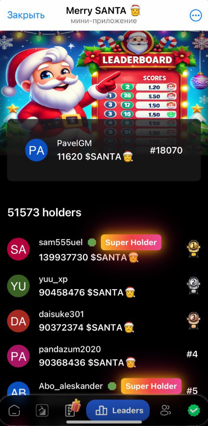 Merry Santa – тапалка с механикой автоматического майнинга токенов Santa и проверкой аккаунта Telegram, как в Dogs. Пользователям предстоит качать хешрейт, наращивать объемы добычи и клеймить внутриигровые монетки, чтобы в момент airdrop и listing продать их и заработать.
