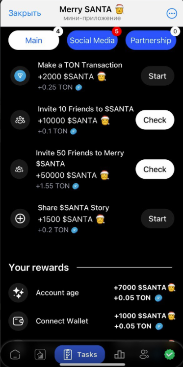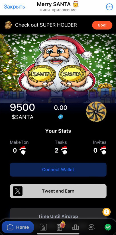 Выполняем социальные задания, получая взамен токен тапалки Merry Santa и немного TON. Кстати, одно из заданий, а именно Tweet and Earn выведено на Home-страницу. Делаем его в первую очередь и забираем солидную награду в монетах Santa.