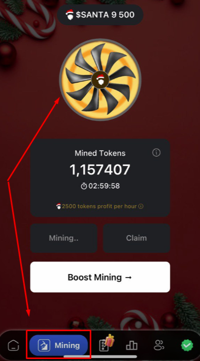 Здесь жмем на кнопку с аналогичным названием – Mining, после чего происходит запуск 3-часового цикла добычи монет Santa. Когда счетчик обнулится, нужно будет зайти и нажать Claim, чтобы забрать монеты.